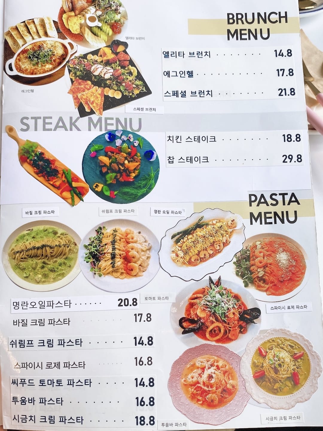 테이블 위 꽃 병도 한 컷 담았습니다. 조화지만 그 예쁜 자태가 마음을 몽글몽글하게 만들어주는 힘이 있네요. 지금부터는 제일 궁금해하실 메뉴판을 소개합니다. 엘리타는 말 그대로 브런치 카페이기 때문에 메뉴에는 카페의 '분위기'값이 포함되어 있다고 보시면 되겠습니다.