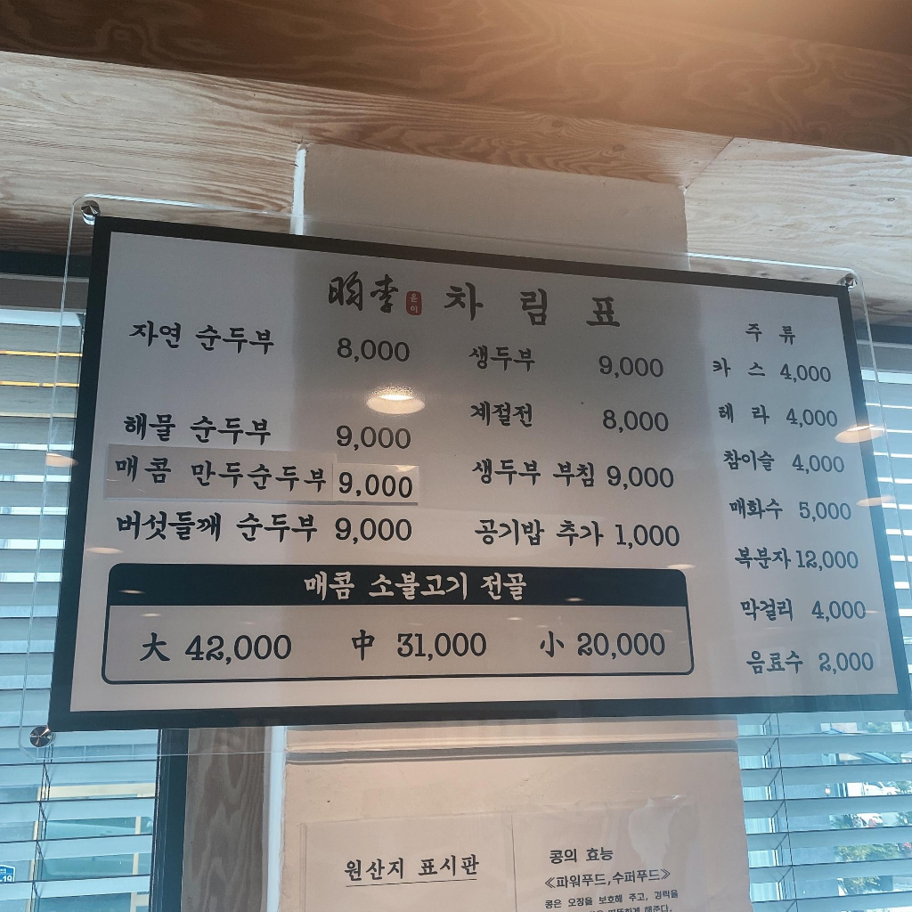 메뉴판에선 매콤 소불고기 전골이 더 눈에 잘 띄었다. 그래도 "윤이"는 순두부 전문점이니까 대표 재료로 만든 순두부를 먹어봐야지. 100% 국내산 콩으로 만들고 아침 일찍부터 그 콩으로 순두부를 직접 만들어 낸다면 음식 가격은 그 노력에 비해 비싸지 않은 듯하다.