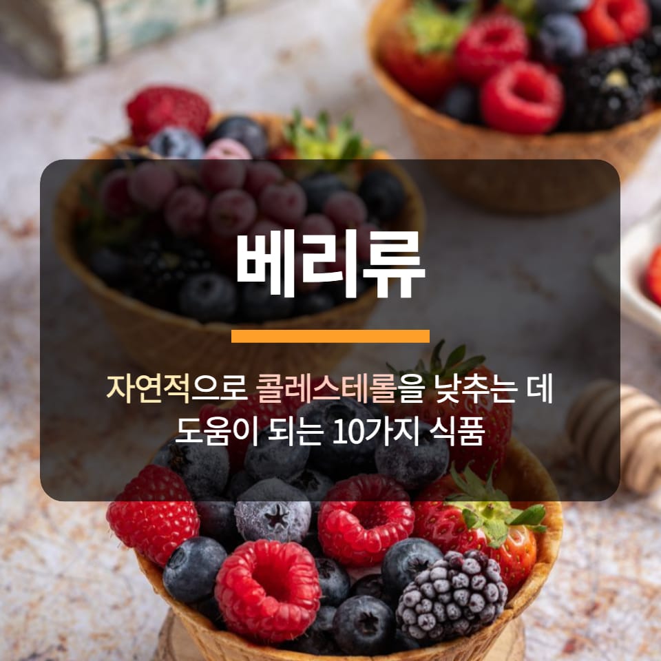 블루베리, 딸기, 라즈베리와 같은 베리류는 항산화제와 식이섬유가 풍부하여 콜레스테롤을 낮추는 식단에 훌륭한 추가 식품입니다. 미국 임상 영양학회지에 발표된 한 연구에 따르면 하루에 약 2인분의 베리를 섭취하면 LDL 콜레스테롤 수치를 최대 6%까지 낮출 수 있는 것으로 나타났습니다.