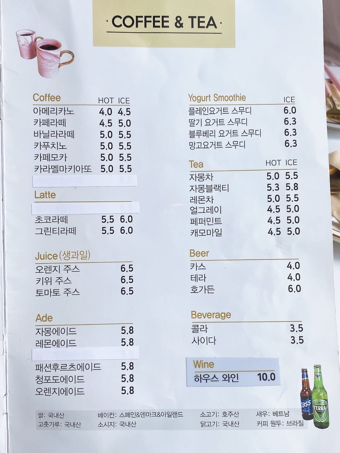 나름 음료는 저렴해보입니다. 엘리타 카페 입장에서는 음료만 주문하는 손님이 별로 반가울 것 같지는 않아 보입니다. 특히 손님이 몰리는 요일과 시간대에 눈치 보지 않고 시간을 보내려면 1인 1 메뉴는 필수인 듯하네요. ^_^